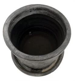 Heavy glazed ceramic pot with attached saucer in shades of tan, green and blue with a glossy finish. One drainage hole, attached saucer and foam pads on base to prevent scratching.