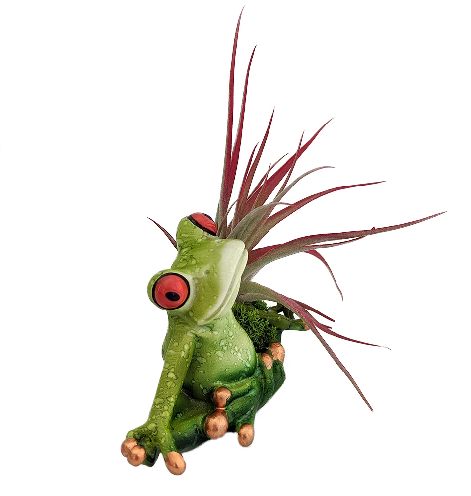 Yoga Frog with easy to care for Tillandsia air plant. Mist once per week and provide bright, indirect light.